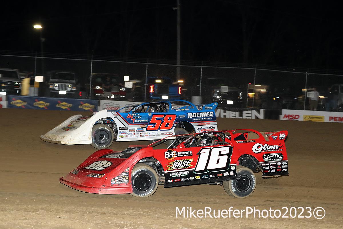 Babb took immediate control at the drop of the green, until a pair of quick cautions slowed the race on laps three and seven respectively. Once the field got back underway, Babb would stretch out the advantage to just over two seconds with Brandon Sheppard and Timm pursuing the leader through heavy lapped traffic. Sheppard used the lapped traffic to close the gap on the Vic Hill powered Longhorn Chassis of Babb to just over .330 seconds as the race worked to under twenty laps to go.